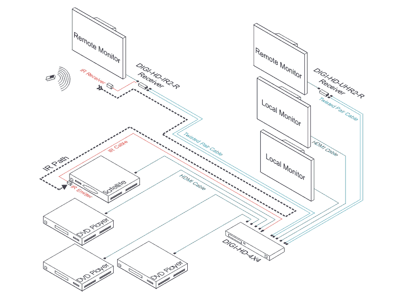 IR pass-through. Tired of third-party IR switchers and patch panels? When used in conjunction with an Intelix DIGI-HD-IR3-R receiver, the DIGI-HD-4X4 matrix distributes remote IR commands over twisted pair cable, through the matrix, and out to local sources. This means the DIGI-HD-4X4 transmits IR signals from your remote destination back to the rack, switches them inside the matrix, and distributes them to your cable boxes, DVD player, or other local source device.